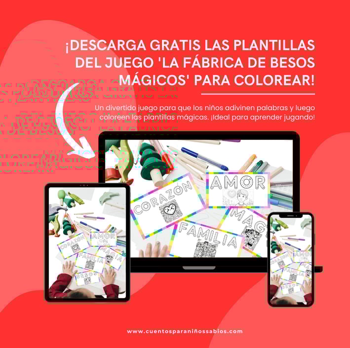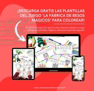 En 'La fábrica de besos mágicos', los niños se embarcarán en una emocionante aventura en un mundo de fantasía lleno de sorpresas. A medida que juegan, deberán adivinar palabras escondidas que están relacionadas con los mágicos besos de la historia. Cada descubrimiento será una oportunidad para aprender y divertirse al mismo tiempo. Al descargar las plantillas del juego, tus hijos no solo se entretendrán adivinando las palabras, sino que también podrán dar rienda suelta a su creatividad al colorear los entrañables personajes y las palabras que vayan descubriendo. Esta experiencia de juego promete estimular su imaginación y reforzar su aprendizaje de una manera divertida y mágica. ¡Prepárate para un viaje donde los besos son la clave para desbloquear un mundo lleno de alegría y aprendizaje!